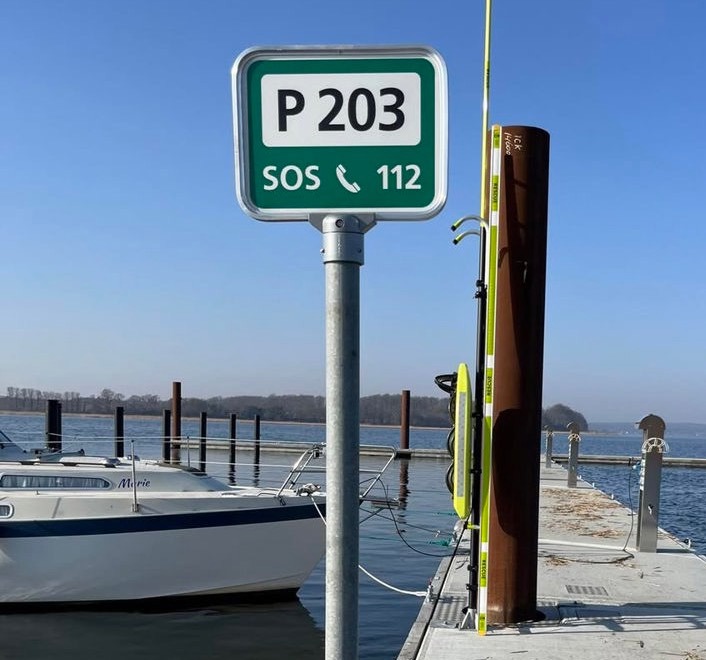 Så fik vi omsider et redningsnummer på Bro 10 - det her lille grønne skilt, der med et bogstav og et nummer angiver en position. Hvis man ringer 112, kan man henvise til det skilt, og så ved redningsholdet, hvor de skal køre hen.